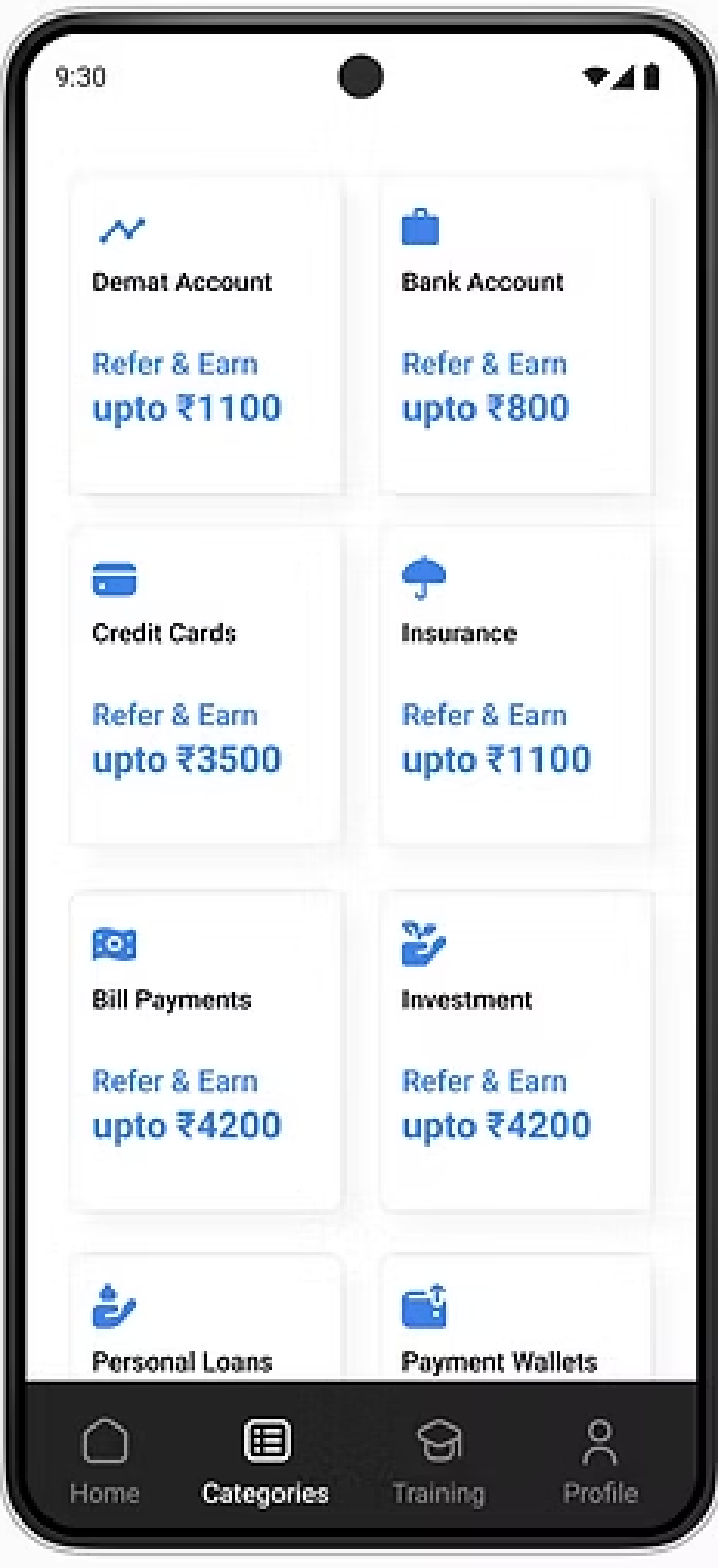 Choose category (Credit card, Loans etc,.)